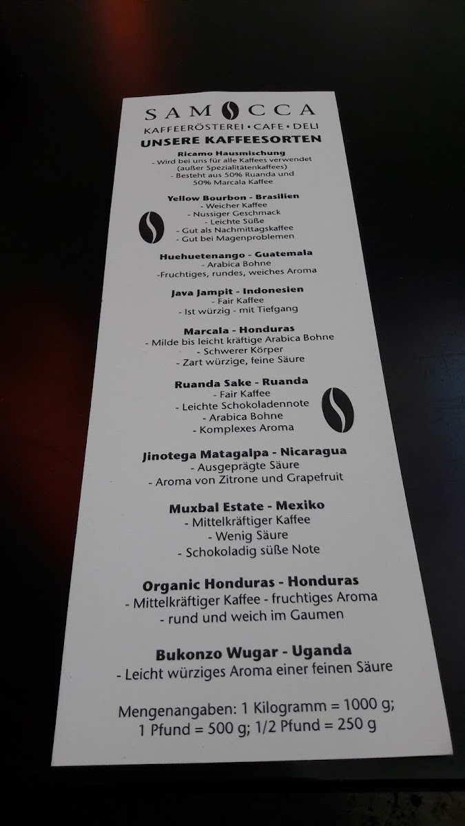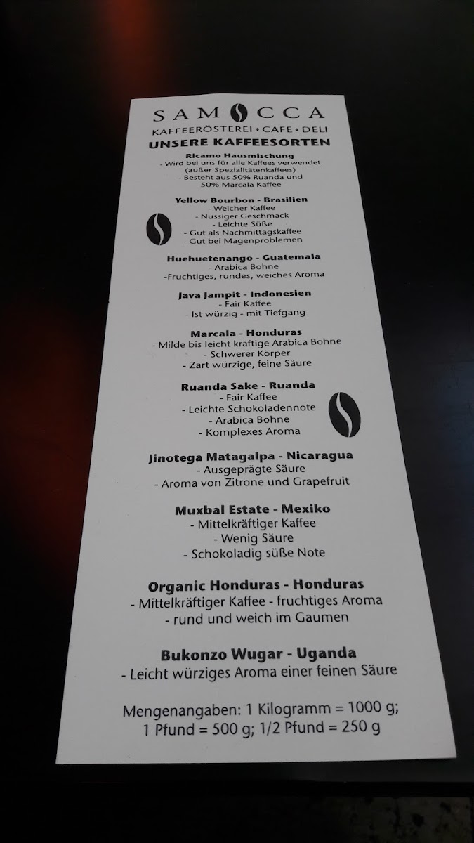 The menu at Kaffeehaus SAMOCCA offers a variety of options suitable for breakfast, coffee breaks, and light meals throughout the day. It features a selection of freshly roasted coffees, including classic brewed coffee and specialty coffee drinks. Complementing the coffee choices, there is a range of cakes and pastries such as apple cake, assorted tortes, and traditional German-style cakes available for dessert or snack times.